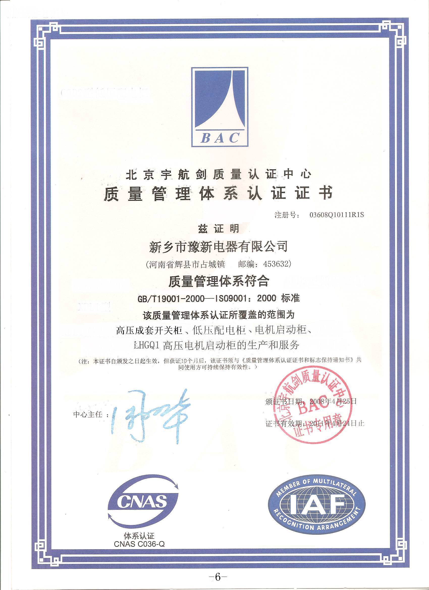 高壓綜合啟動柜產(chǎn)品質(zhì)量合格證書